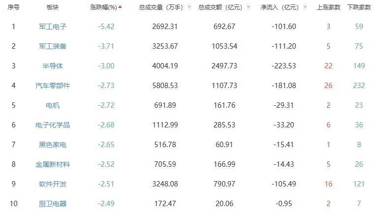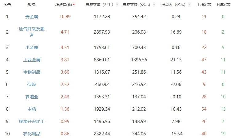 板块方面,贵金属、油气开导及处事、小金属等板块涨幅居前,军工电子、军工装备、半导体等板块跌幅居前。